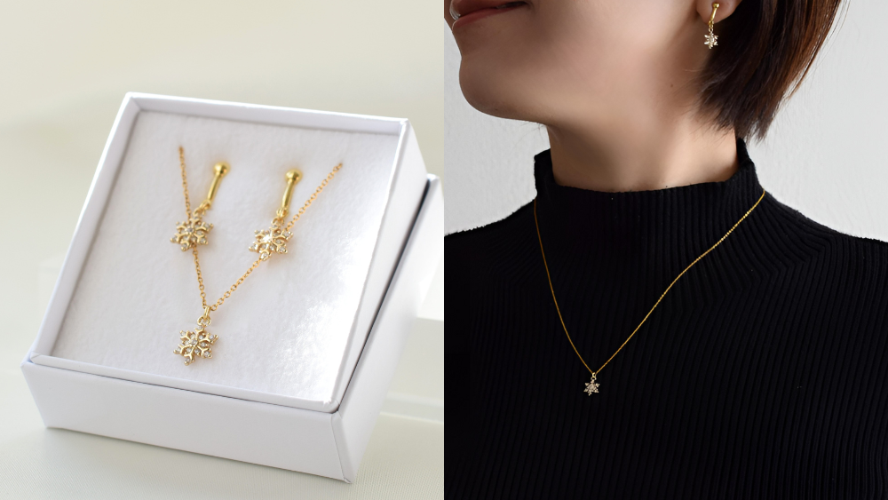 光の屈折率(輝き)がダイヤモンドとほぼ同様の人工石、キュービックジルコニアが埋め込まれた雪の結晶モチーフイヤリング・ネックレス。